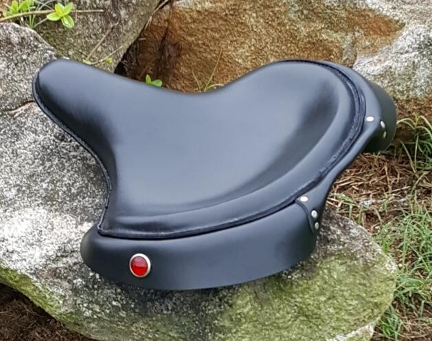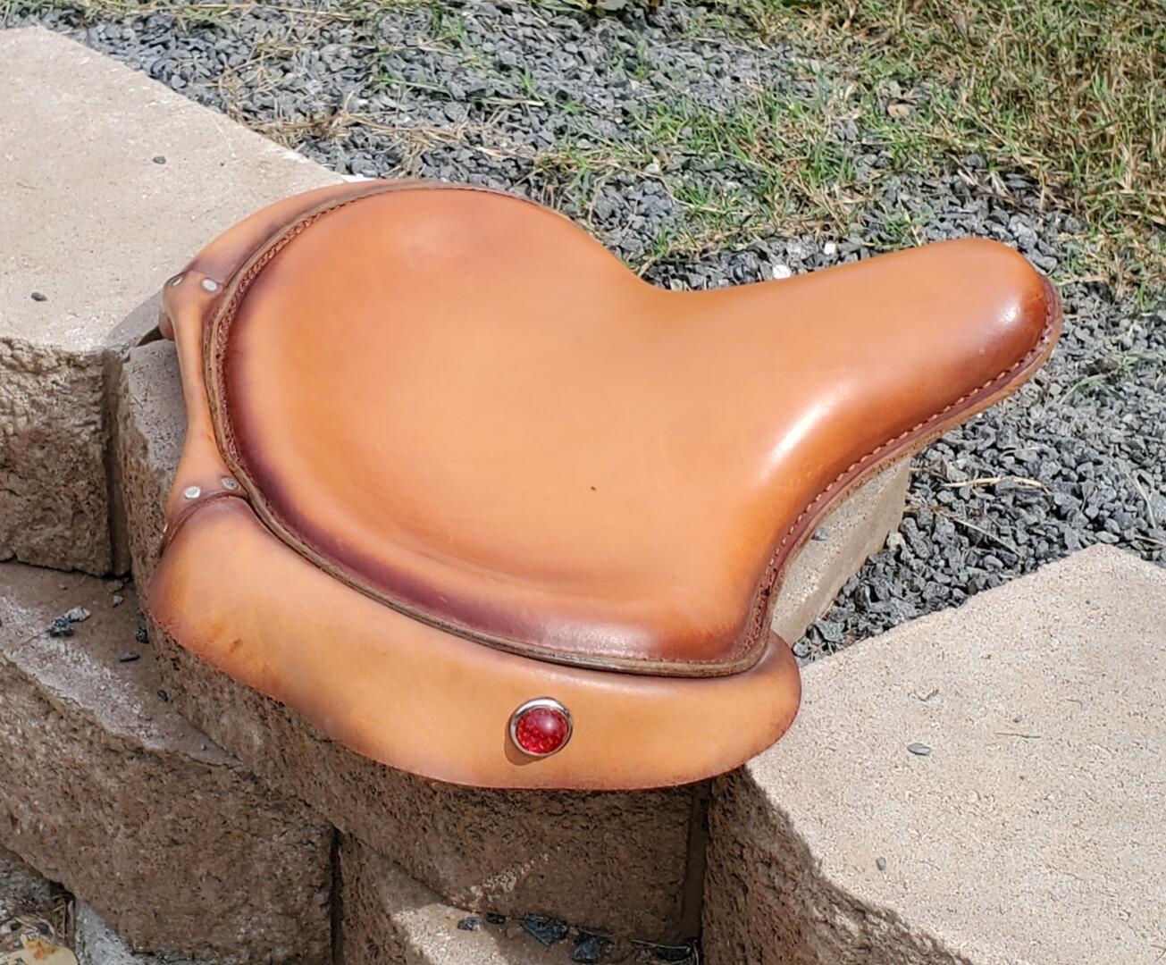 The seat is built on a vented H-D re-pop seat pan. The skirt had two medium faceted jewels, one on each side of the three piece leather skirt. The two side skirt pieces are longer than the center piece, and the center piece skirt being shorter, by virtue of being sewn doubled, in order to clear the rear fender. The two outside skirt pieces are riveted to the center skirt by three rivets on each end of the center skirt. All three are sewn onto the solo seat with a double row of stitching.