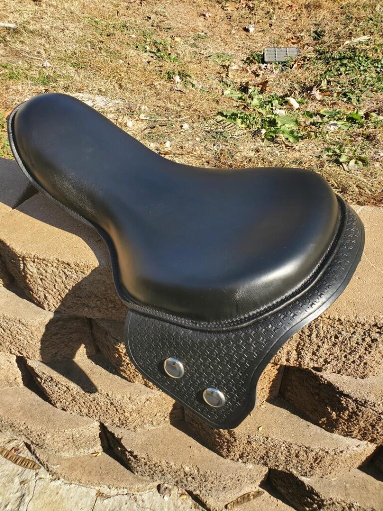 Black leather, black stitching, there is almost a solid row of 3/8 nickel spots along the edge of the skirt.