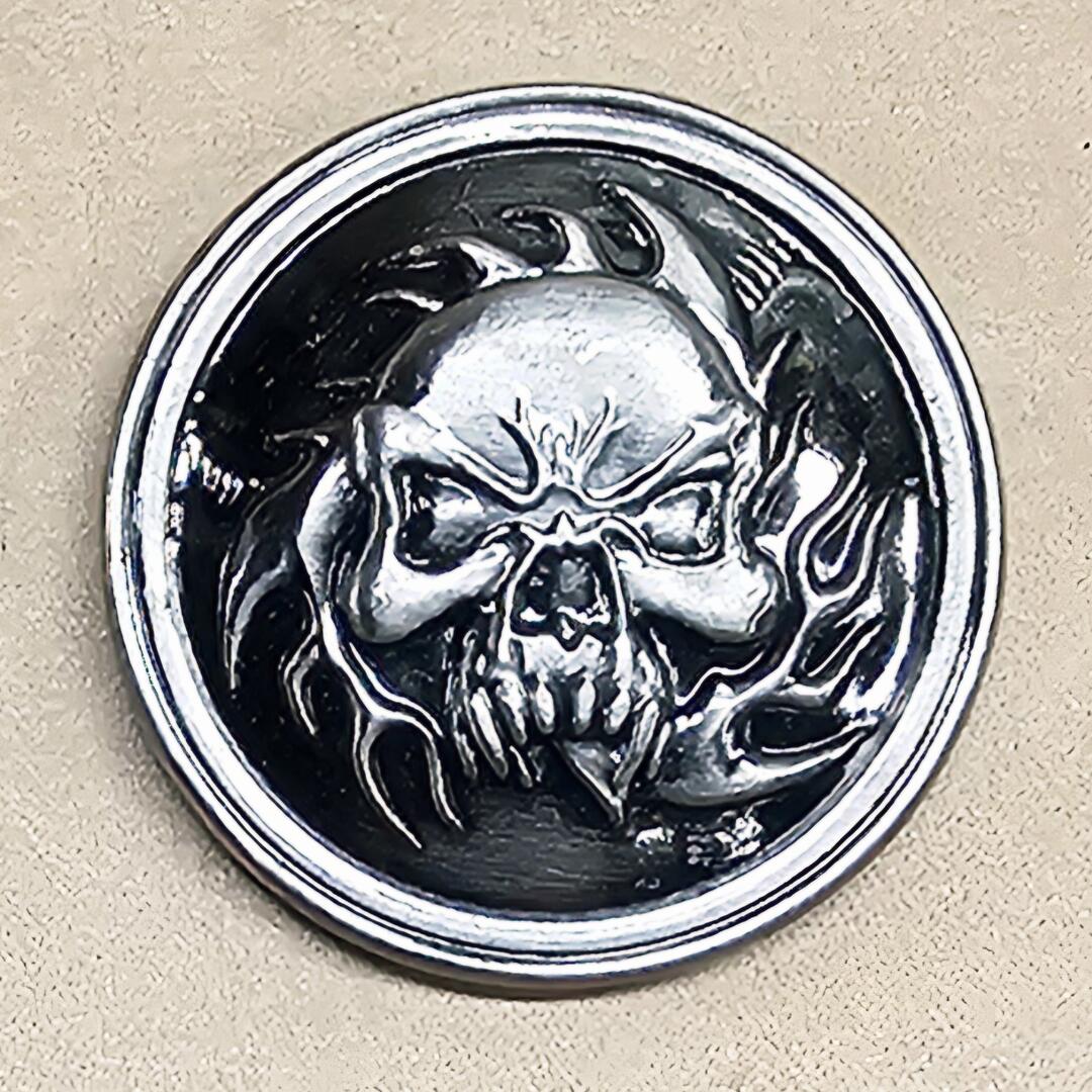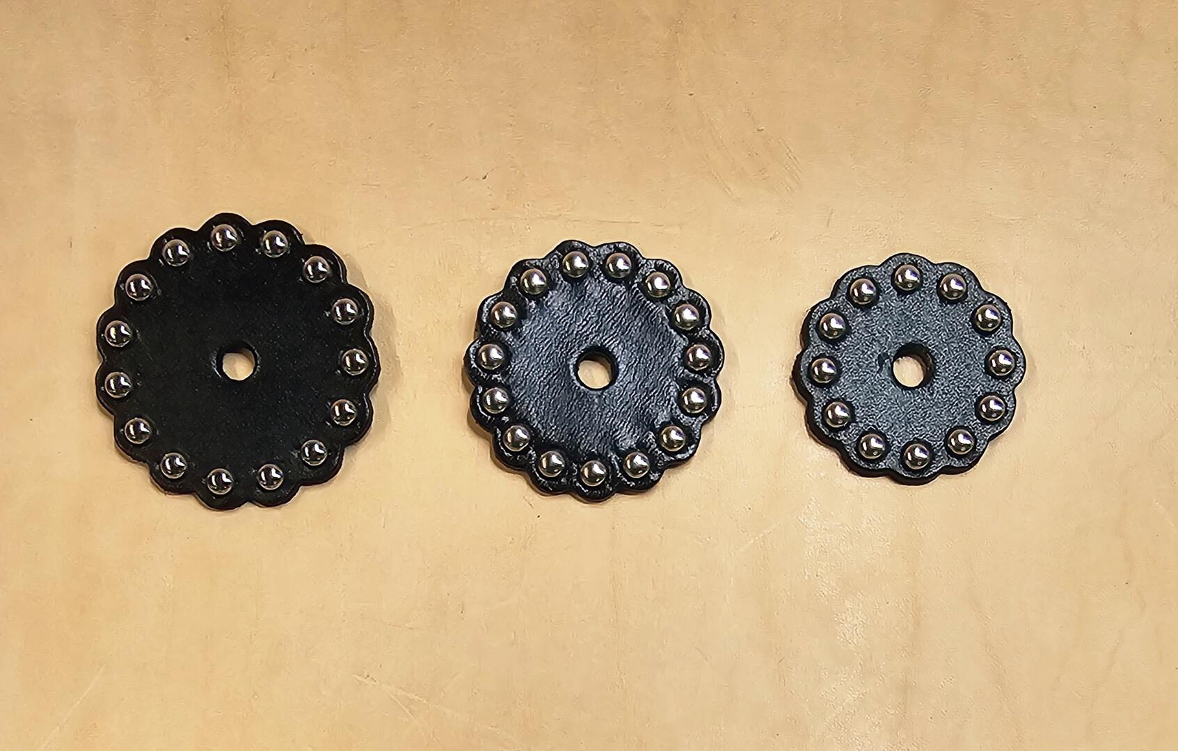 This Indian Head concho features a left, and/or right-facing Indian in a full headdress and can complement the two sides of a skirted seat that includes conchos, or on a pair of saddle bags that include conchos. Made from Nickel, measures 1 ½”.